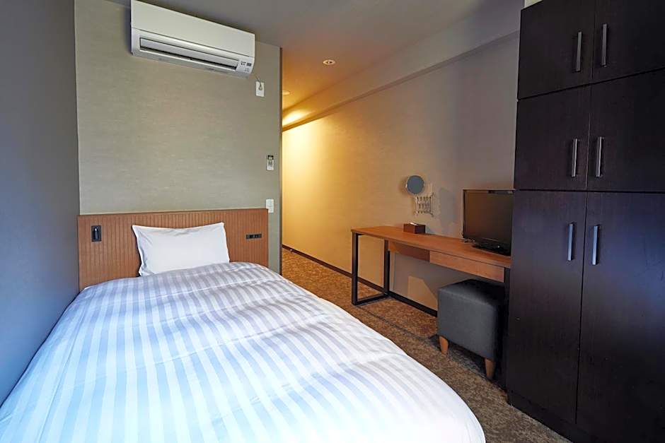 Room featuring a basic wood-and-white decor, fitted with a semi-double bed (47 in wide), an LCD TV and free wired internet. A small fridge and complimentary green tea are provided, while the attached bathroom comes with free toiletries.